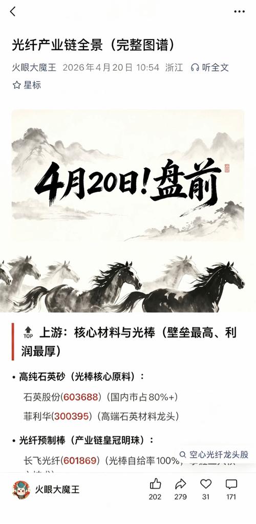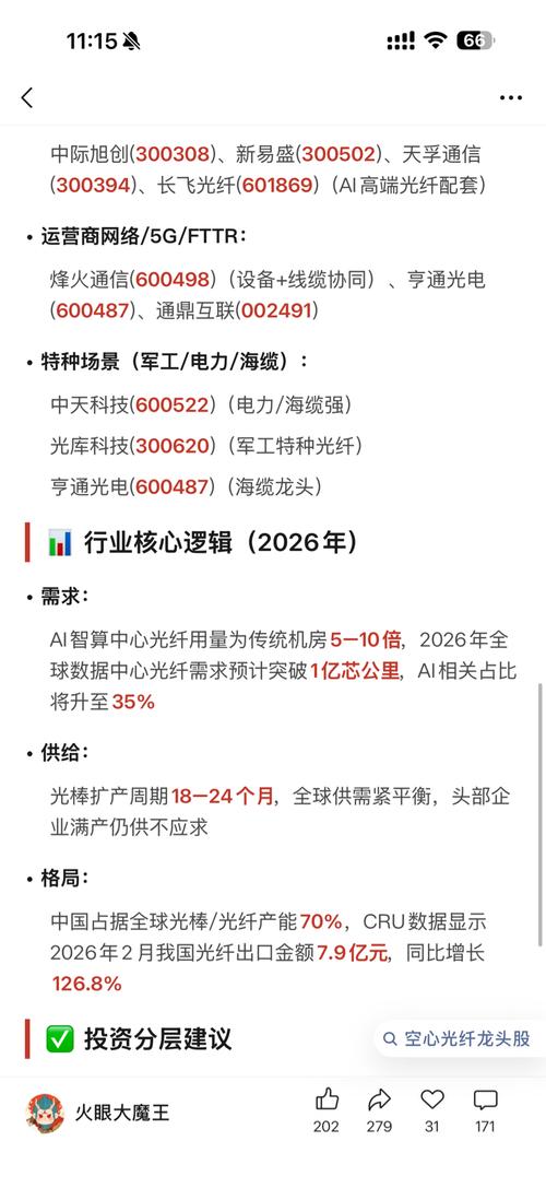 $长飞光纤(SH601869)$$光迅科技(SZ002281)$$海康威视(SZ002415)$ 光纤被视为AI时代的"算力神经脉络",全球产能约70%集中在中国,核心瓶颈在光棒(占成本约70%)。产业链按价值与壁垒分为上游材料/核心器件→中游制造→下游应用,以下是完整链路与对应A股标的。 上游:核心材料与光棒(壁垒最高、利润最厚) •高纯石英砂(光棒核心原料): 石英股份(603688)(国内市...