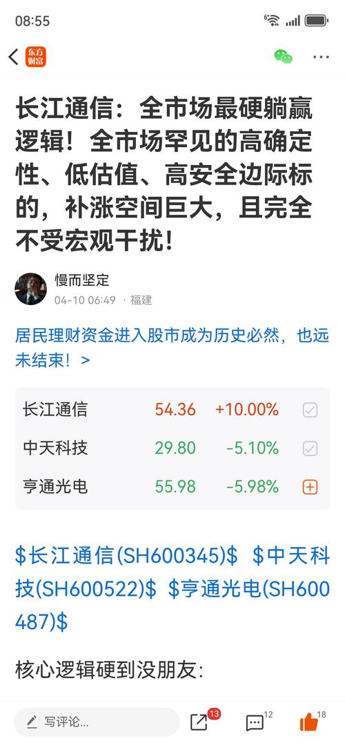 $长江通信(SH600345)$$长飞光纤(SH601869)$$汇源通信(SZ000586)$ 开弓没有回头箭: 0409,在长飞光纤市值突破3000亿后,长江通信以一个涨停板宣布主升浪正式启动,0410在光纤被小作文带蹦情绪下,依然强势涨停!同时前期5连板龙头汇源通信跌停,长江通信完美卡位,都在本人预期中。 长江通信是长飞光纤大股东,持有大量长飞股权。长飞1000亿市值时,长江通信股价滞涨,市...