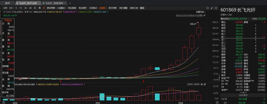 在A股,最痛苦的事是刚卖掉一只股票后不久,它就起飞。 而把这种痛苦直接拉满的,是持有超过20年的老股东,清仓离场后,眼睁睁看着它过了没多久就翻了数倍。 长飞光纤就是活生生的例子。 自去年12月起,长飞光纤的股价每个月都在刷新一次历史新高,从87.08元一路冲到今年4月的高位398.31元,短短不到5个月翻了4.6倍,直接把自己推成了“湖北...