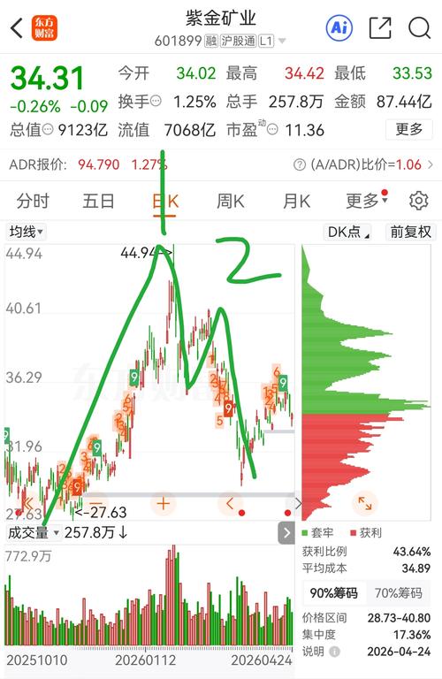 晚间话紫金矿业:周五回顾与明日展望 周五回顾:早盘34.02元开,最高冲至34.42元,最低下探33.53元,最终收盘34.31元,下跌0.26%,单日振幅2.59%,股价全天运行区间集中在33.53-34.42元。全天成交量257.8万手,成交额87.44亿,换手率1.25%,量比0.87,资金活跃度较前一交易日有所回落;委比-18.26%,卖盘力量稍占优势,内盘成交135.5万手,外盘成交12...