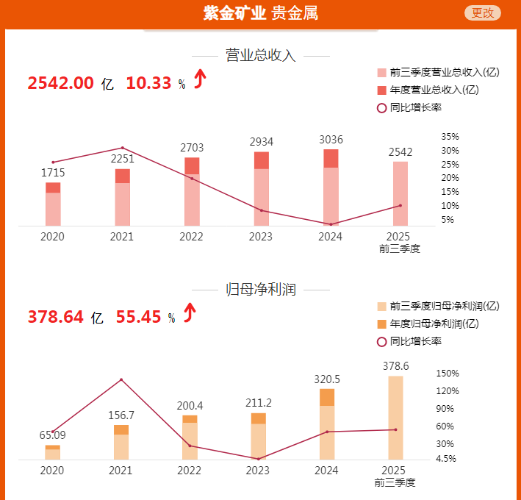 - 紫金矿业持续高成长,当前约16倍市盈率,严重低估,应给予40~50倍的市盈率,股价至少应该翻倍。 紫金矿业近些年净利润连续快速增长,从2019年的净利润42.84亿元算起,到2024年的320.5亿元,复合增长率为49.5%,持续高成长。 2025年三季报,归母净利润378.6亿元,同比增长55.45%,经营净现金流521亿元,增长44.3%,远高于净利润,当前约16倍市盈率,严重低估。凭借紫金矿业持续性的50%左右的净利润复合增长率,再加上龙头企业溢价,应该给予40-50倍市盈率估值才合理,股价至少应该翻一倍到两倍。 紫金矿业自主勘探与投资并购双轮驱动,资产数量和营收净利持续增长,使得股价虽然不断上升,但市盈率和估值仍处于历史低位。 尤为突出的是,紫金矿业赚的钱,是真正的“真金白银”,盈利质量极高。 2024年,公司净利润320.5亿元,同比增长51.76%,经营现金流达到488.6亿元,同比增长32.56%,且远高于同期净利润;2025年上半年,净利润232.9亿元,增长54.4%,经营现金流288.3亿元,增长41%,同样远高于同期净利润。 这说明,紫金矿业的经营回款极佳。赚的“钱”能真真切切落袋,而非停留在纸面上。 因为业绩不断增长,所以公司股价虽然不断上升,但估值得到消化,市盈率始终处于低位。 按照今年500亿元净利润的保守估算,公司当前市盈率约16倍左右,而其历史平均市盈率超26倍。 紫金矿业,投资并购无止境,资产膨胀无止境,业绩增长无止境!
