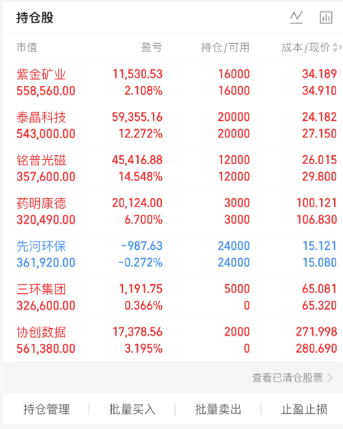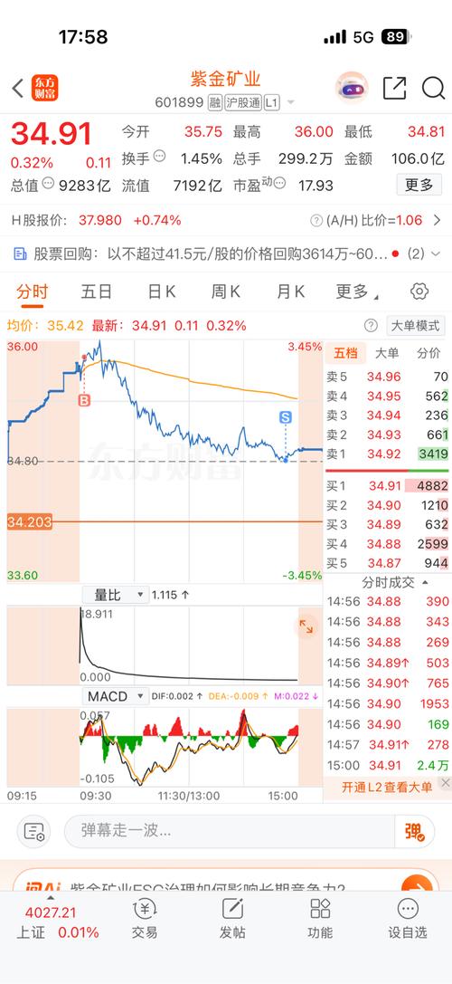 $紫金矿业(SH601899)$ 今天震荡回落,收了一根假阴线,正好是反弹到三十六附近的位置,早上的思路是到这个位置就减半仓,减仓不是不看好了,就是在最底部的时候加的仓,现在反弹到压力位了,正常的操作策略,底仓还是要继续格局的,中线它再创历史新高的逻辑是没有变的,它后续的走势在这个位置上震荡之后,还是会突破今天的高点。