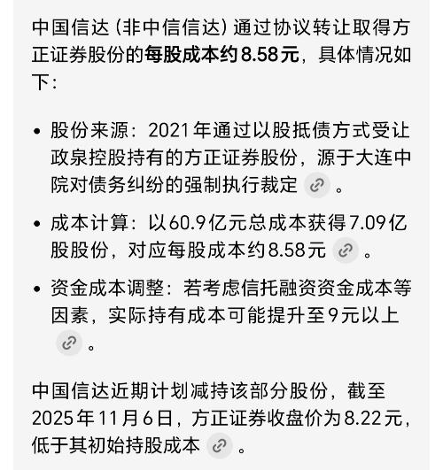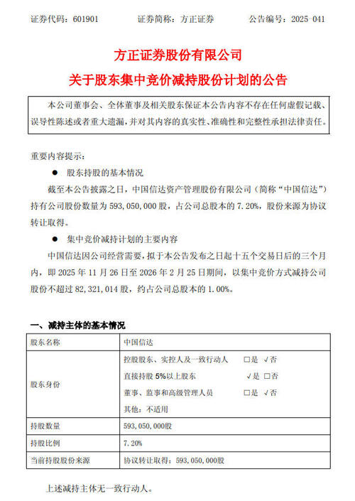 11月4日,方正证券公告称,公司股东中国信达因经营需要,拟于2025年11月26日至2026年2月25日期间,通过集中竞价方式减持其持有的公司股份不超过8232.1万股,约占公司总股本的1%。$方正证券(SH601901)$