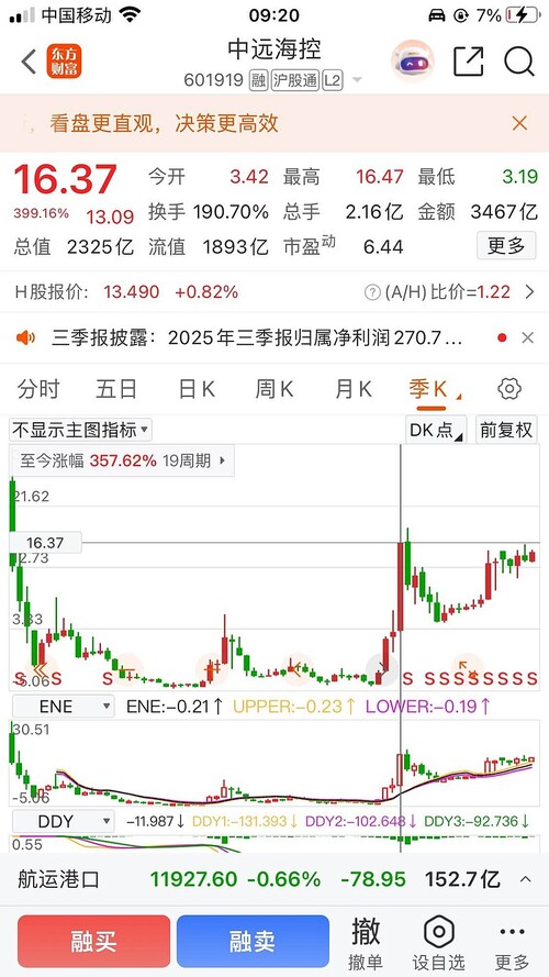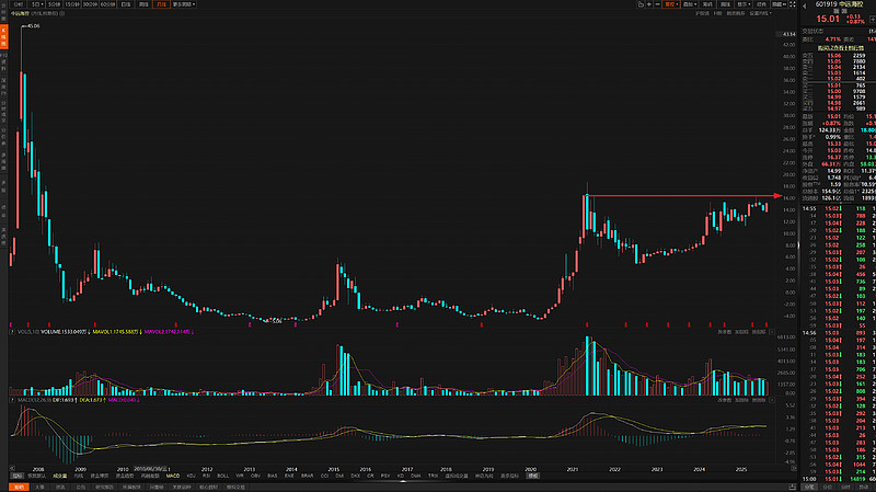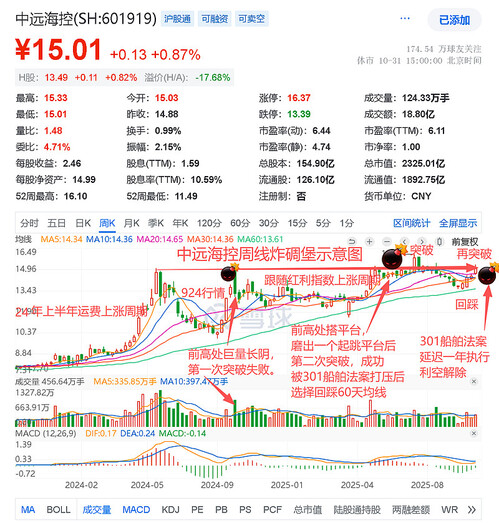 中远海控周线“炸碉堡”示意图,第四次上攻能否创创下十年新高? 来自能源的革命的雪球专栏 $中远海控(SH601919)$ 除上市那年以外,海控的季线收盘高点在16.37元。当前股价15元,加上两个季度的盈利,每股净资产就能达到或超过16.37这个位置。 银行股除外,还有哪家公司一年赚360亿,市值仅有2325亿的? 净利润大于270亿,资产负债率小于60%,总市值小于2500亿的上市公司,A股只有...