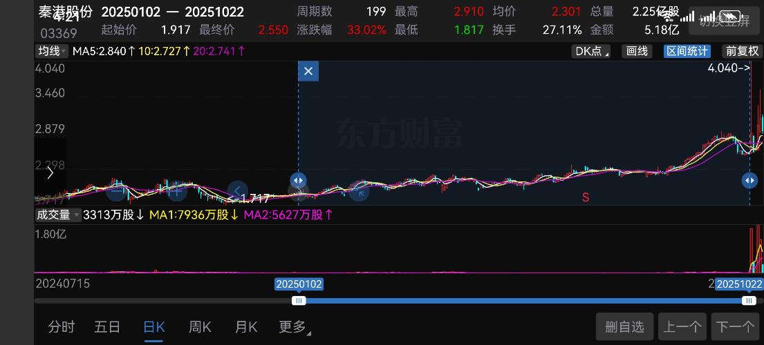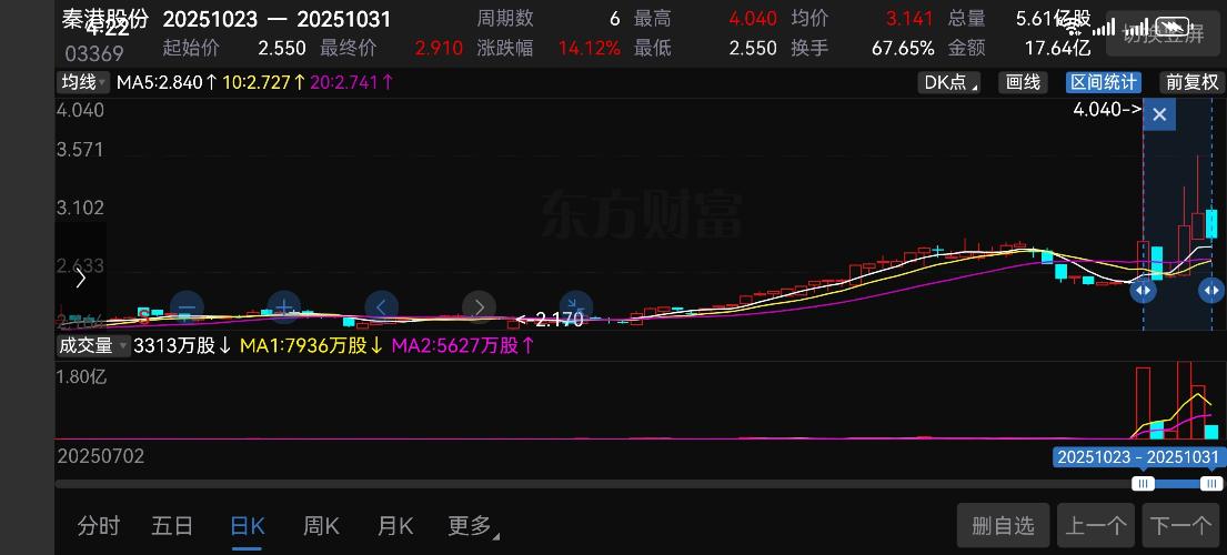 $平潭发展(SZ000592)$ $中远海控(SH601919)$ $厦门港务(SZ000905)$ 秦港股份,突然暴动,意欲何为? 一,成交额急剧增加,股价上蹿下跳。 10月15日~10月22日六个交易日成交额一共才0.12亿元,10月21、22两天成交额只有44万元、86万元,几乎是死水一潭,无人问津,六日股价涨幅-6%。 10月23日~10月31日六个交易日一共成交额17.64亿元、成交量5...