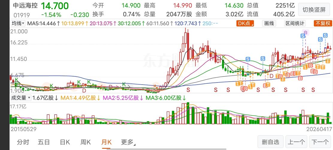 中远海控:股价围绕15元压力线横盘6年,久攻不破,久盘必跌(4-18)