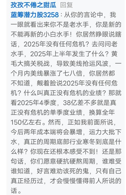 $中远海控(SH601919)$最近股吧里怎么了?全是啥也不懂的新兵蛋子嫩韭菜,要么就是恶意唱空的空狗。观点不变,明确告诉大家:大底部了,这个位置唱空的就不配来海控。看着一帮啥也不懂的新兵蛋子七嘴八舌、胡说八道唱空海控,实在看不下去了,必须严厉呵斥这帮居心叵测的傻缺,以正视听。