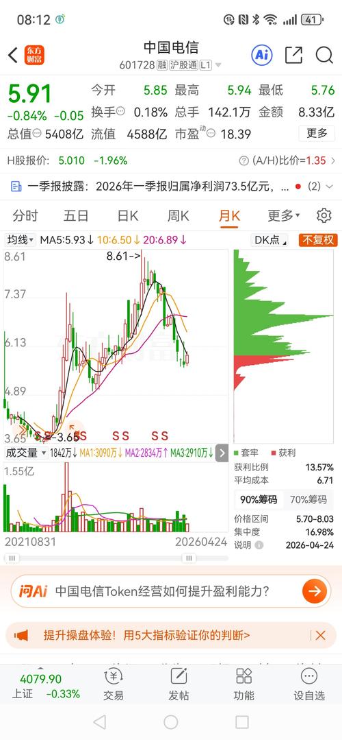 $建设银行(SH601939)$我有建设银行和中国电信的股票,谈体会。 你说得很对,从月K线的表现来看,中国电信和建设银行的走势确实是冰火两重天,两者完全不在一个节奏上。 一、先看数据对比,一目了然 标的近一年走势月线趋势核心特点 中国电信从2025年高点8.34元跌到当前5.91元,近一年跌幅约20%月线已跌破5月、10月、20月均线,处于典型的下降通道,近10个月中仅少数月份收阳高位回落、持续...