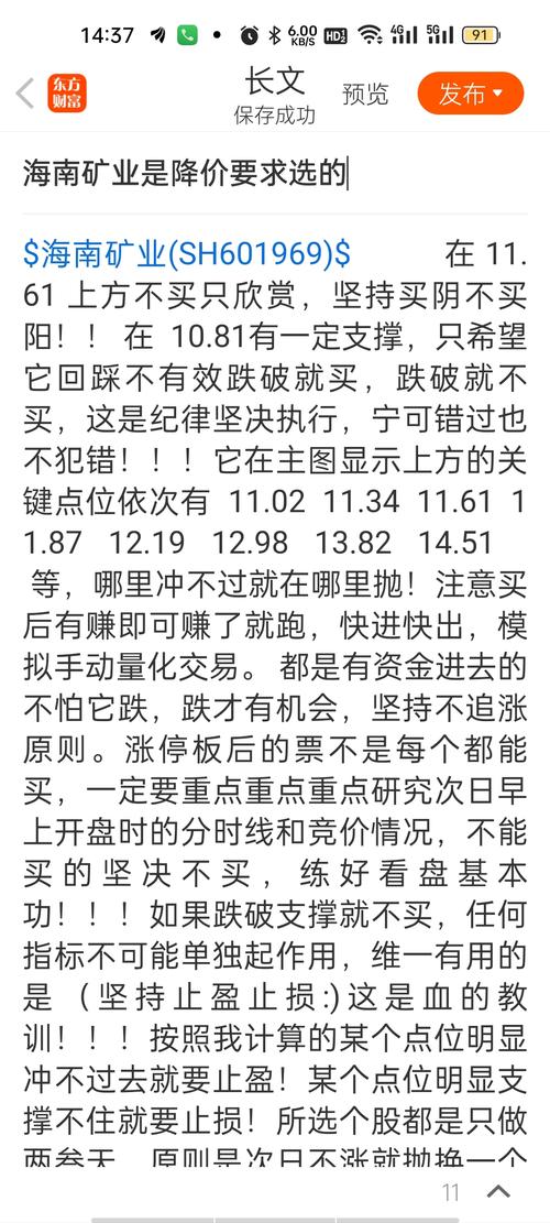 $海南矿业(SH601969)$在11.61上方不买只欣赏,坚持买阴不买阳!!在10.81有一定支撑,只希望它回踩不有效跌破就买,跌破就不买,这是纪律坚决执行,宁可错过也不犯错!!!它在主图显示上方的关键点位依次有11.0211.3411.6111.8712.1912.9813.8214.51等,哪里冲不过就在哪里抛!注意买后有赚即可赚了就跑,快进快出,模拟手动量化交易。都是有资金进去的不怕它跌,...