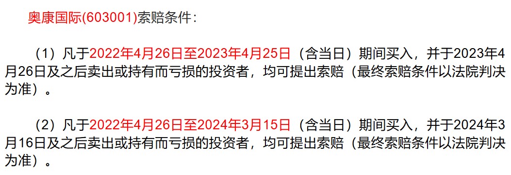 $奥康国际(SH603001)$#股市怎么看#奥康国际(603001)索赔条件:(1)凡于2022年4月26日至2023年4月25日(含当日)期间买入,并于2023年4月26日及之后卖出或持有而亏损的投资者,均可提出索赔(最终索赔条件以法院判决为准)。(2)凡于2022年4月26日至2024年3月15日(含当日)期间买入,并于2024年3月16日及之...