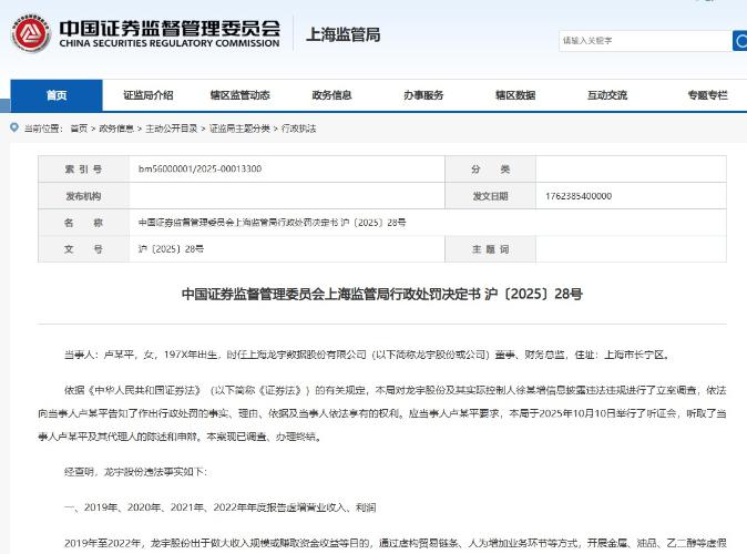 2025年11月7日,龙宇股份公告收到《行政处罚决定书》。证监会上海监管局认定,龙宇股份存在虚构业务虚增利润、未按规定披露大额关联交易情形,导致公司2019年至2022年年度报告、2023年半年报存在虚假记载、重大遗漏