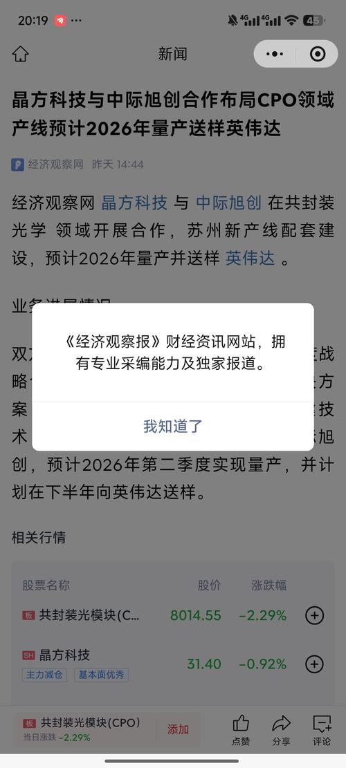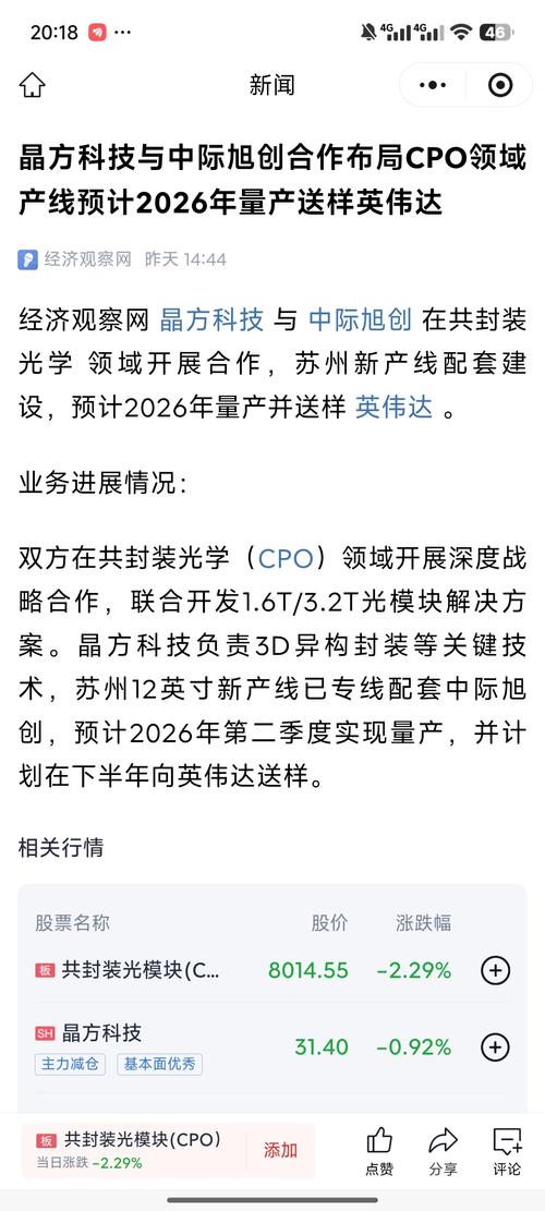 晶方科技与中际旭创合作布局CPO领域产线预计2026年量产送样英伟达 作者:经观智讯2026-04-2411:05 经济观察网晶方科技与中际旭创在共封装光学领域开展合作,苏州新产线配套建设,预计2026年量产并送样英伟达。 业务进展情况: 双方在共封装光学(CPO)领域开展深度战略合作,联合开发1.6T/3.2T光模块解决方案。晶方科技负责3D异构封装等关键技术,苏州12英寸新产线已专线配套中际旭...