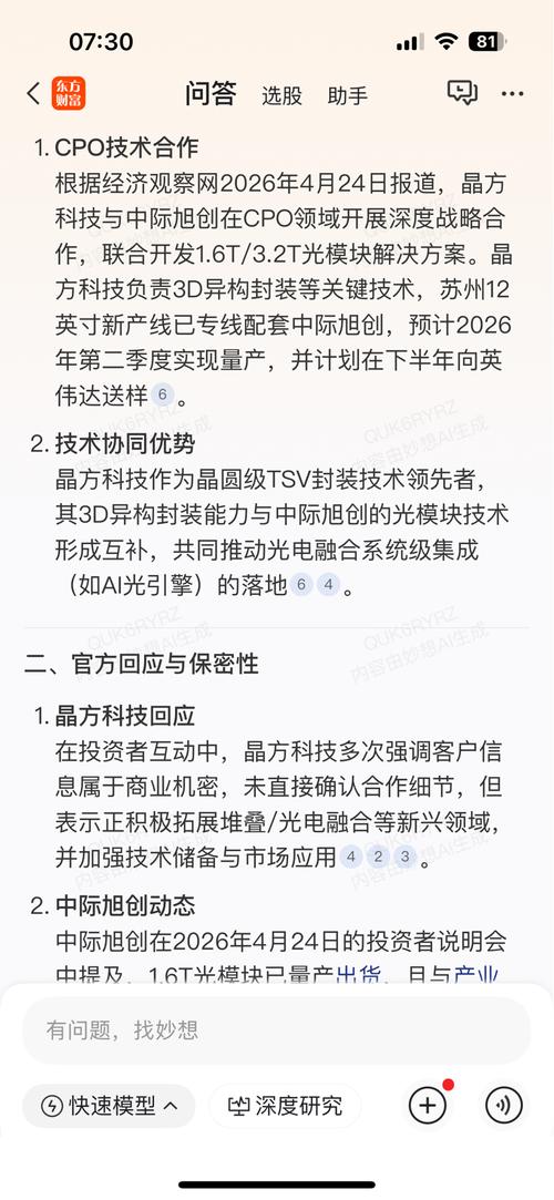 $晶方科技(SH603005)$ 一、晶方科技×中际旭创:深度绑定,已量产 •有合作,且是深度战略合作(非股权) •合作内容(2026年4月最新) 技术:联合开发1.6T/3.2TCPO(共封装光学)方案 中际:硅光芯片、光引擎设计 晶方:独家3D异构封装、TSV、WLO光学集成 产线:晶方苏州12英寸新产线专线配套中际(2026年Q1-Q2量产) 订单:晶方为中际1.6T/CPO独家封测,并进入...