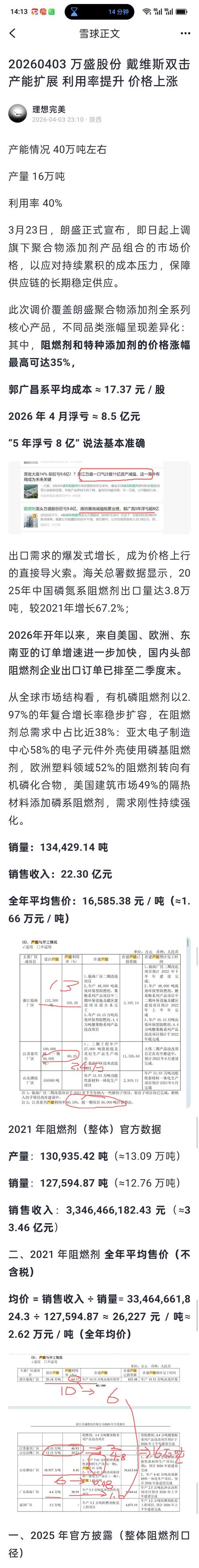 $万盛股份(SH603010)$ $万盛股份(SH603010)$戴维斯双击产品价格上涨,产能利用率提升产品供不应求加速替代溴系阻燃剂 溴素、锑化物价格暴涨,推动溴系阻燃剂成本大幅上行,下游迫于成本压力,加速转向磷系阻燃剂。 公司作为磷系阻燃剂龙头,直接受益于替代需求集中释放,产品价格上涨,产能利用率显著提升,量价齐升。 叠加新能源、工程塑料等领域需求增长,公司迎来阶段性历史机遇。