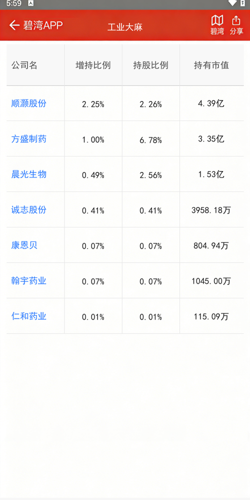 今天刷碧湾APP的时候,无意间翻到工业大麻板块的基金持仓变动,发现顺灏股份被猛加仓啊!$顺灏股份(002565)$增持比例2.25%,现在持股比例2.26%,对应市值都4.39亿了。方盛制药也不赖,增持1%,持股干到6.78%,市值3.35亿;晨光生物、诚志股份和康恩贝也有小幅加仓(数据来自碧湾APP)。这波是机构悄悄布局还是试探性建仓?感觉顺灏这势头有点猛,但不知道能不能持续,有老铁一起盯盘不?...