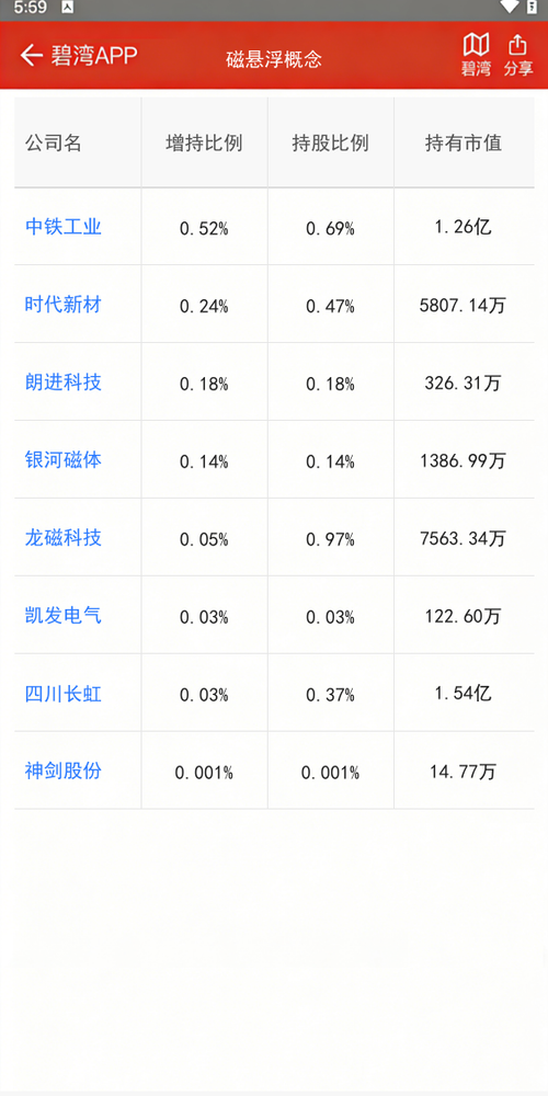 今天刷碧湾APP的时候顺手翻了下磁悬浮概念的基金持仓,发现中铁工业被加仓挺猛啊!$中铁工业(600528)$增持了0.52%,现在持股比例0.69%,对应市值1.26亿,是这批里最多的。时代新材也加了0.24%,持股市值五千八百多万;龙磁科技虽然只加了0.05%,但仓位已经干到0.97%了,市值七千多万。其他像朗进、银河磁体也有小幅增持。感觉机构是不是在悄悄布局这个方向?这波能炒起来不?