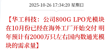 A股盘前传来算力基建领域的重磅消息!华工科技披露,公司800GLPO光模块已于10月在海外工厂正式启动交付,今年四季度交付量将持续上量且产品型号进一步丰富,同时1.6T光模块正为明年上量全力筹备。 这则消息的背后,是AI算力爆发驱动下的产业变革,直接催生超25000亿的蓝海市场。从需求端看,2026年海外数通光模块需求量预计达4000-5000万只且仍将增加,国内需求2000万只,全球市场进入放量...