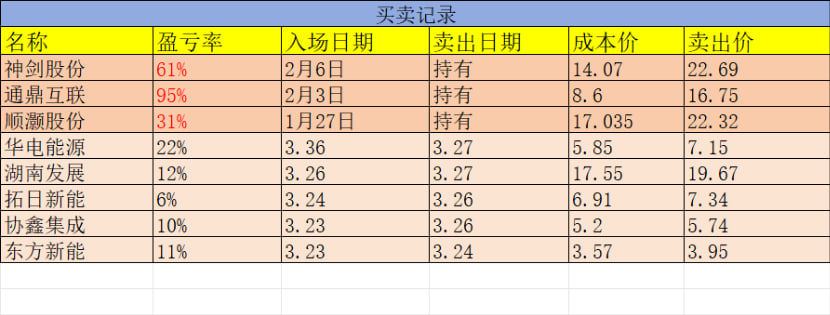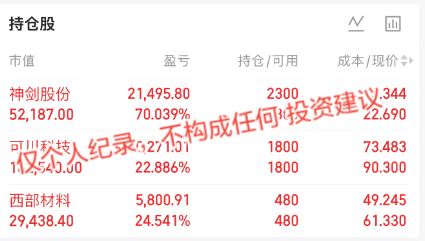 今日收盘情况: $神剑股份(SZ002361)$:高开强势打板,盘中虽然高位开板,最后收盘还是打板 $可川科技(SH603052)$:高位震荡,股价创历史新高。 $西部材料(SZ002149)$:早盘高开,股价创历史新高后回落,主力净流出5.8亿多。 仅个人选标操作情况,不作为任何投资建议!股市有风险,投资需谨慎!