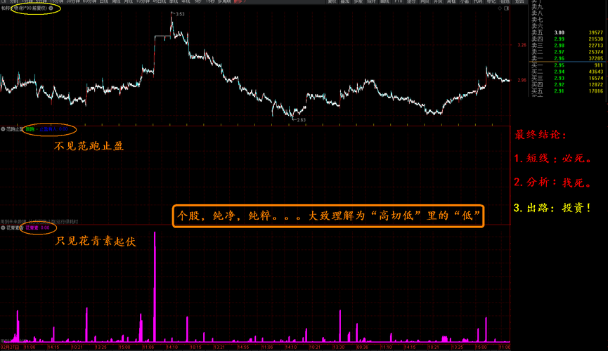 2.93吃的8500股,挂了涨停价,就昏昏沉沉的睡过去了,收盘一看,最高3.01,主力记得,我有8分差价没拿走,2.67元,2.77元,2.87元,这三个点卡一共6万块钱,就控死主力了。搞得主力不敢下杀了!主力怕我吸筹!
