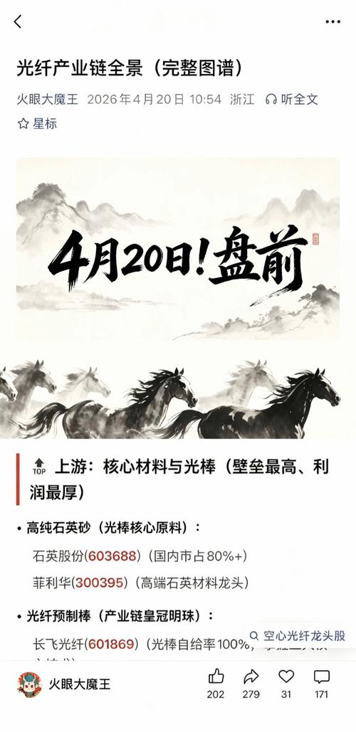 $剑桥科技(SH603083)$$锐捷网络(SZ301165)$$润泽科技(SZ300442)$ 光纤被视为AI时代的"算力神经脉络",全球产能约70%集中在中国,核心瓶颈在光棒(占成本约70%)。产业链按价值与壁垒分为上游材料/核心器件→中游制造→下游应用,以下是完整链路与对应A股标的。 上游:核心材料与光棒(壁垒最高、利润最厚) •高纯石英砂(光棒核心原料): 石英股份(603688)(国内市...