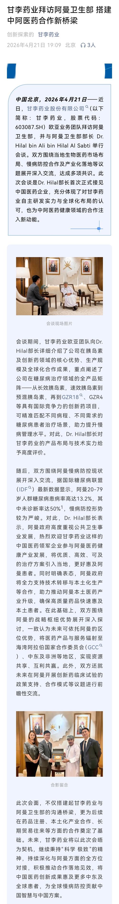 资讯 甘李药业拜访阿曼卫生部