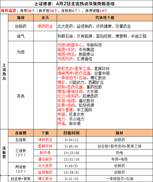 4月2日周四,人气榜梳理 中利集团:柚子合力,再接再厉 津药药业:缩量五连,意犹未尽 和富中国:突破压制,溢价可期 通达股份:巨量回封,且战且退 神剑股份:连续上影,落袋为安 中超控股:炸板留影,见好要收 双鹭药业:封尾漏单,小心为上 雪人集团:高开震荡,继续格局 北大医药:二连偏强,剑指前锋 川能动力:N形反包,主升行情 永鼎股份:前高留影,防守为上 海王生物:低位假阴,空间仍存 中油工程:秒板...