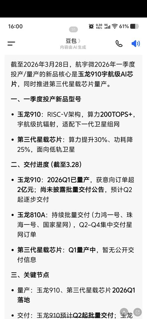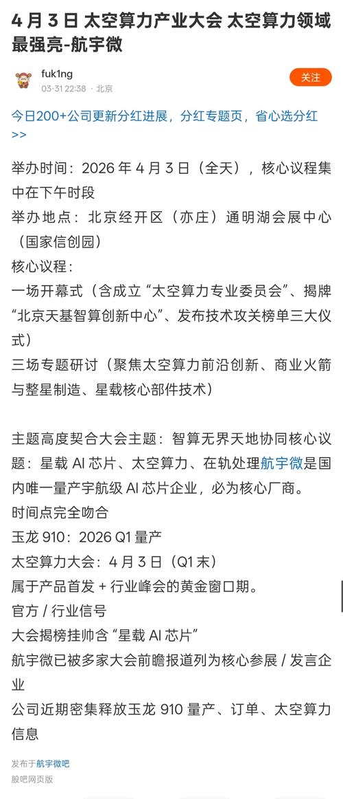 太空算力芯片航宇微300053(俗称太空算力英伟达)4月3日,2026太空算力产业大会将在北京举行,由北京市经济和信息化局、北京经济技术开发区管理委员会、中国信息通信研究院联合主办。国内唯一宇航级AI芯片在轨验证:玉龙810A(12TOPS,功耗2W)通过天舟六号在轨验证,累计运行10万次零故障,抗辐射、极端温度适配能力领先。 玉龙910量产在即(2026Q1):算力200TOPS,较810A提升...