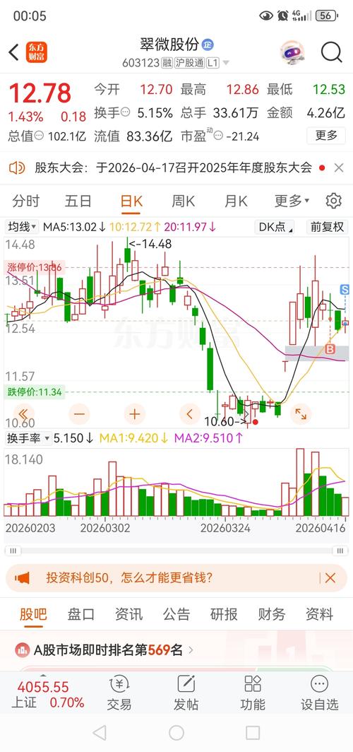 $翠微股份(SH603123)$ 明天(4月17日)翠微股份(603123):小幅震荡、小涨小跌,难大涨难大跌,偏稳。 一、现状(4月16日) -收盘:12.78元,+1.43% -资金:主力净流入1759万(今天回流) -压力:12.96~13.00元(强压) -支撑:12.50元、12.20元 -趋势:连续4天缩量震荡,跌不动、涨不动 二、明天走势判断(4月17日) 1.平开/小幅高开(12....