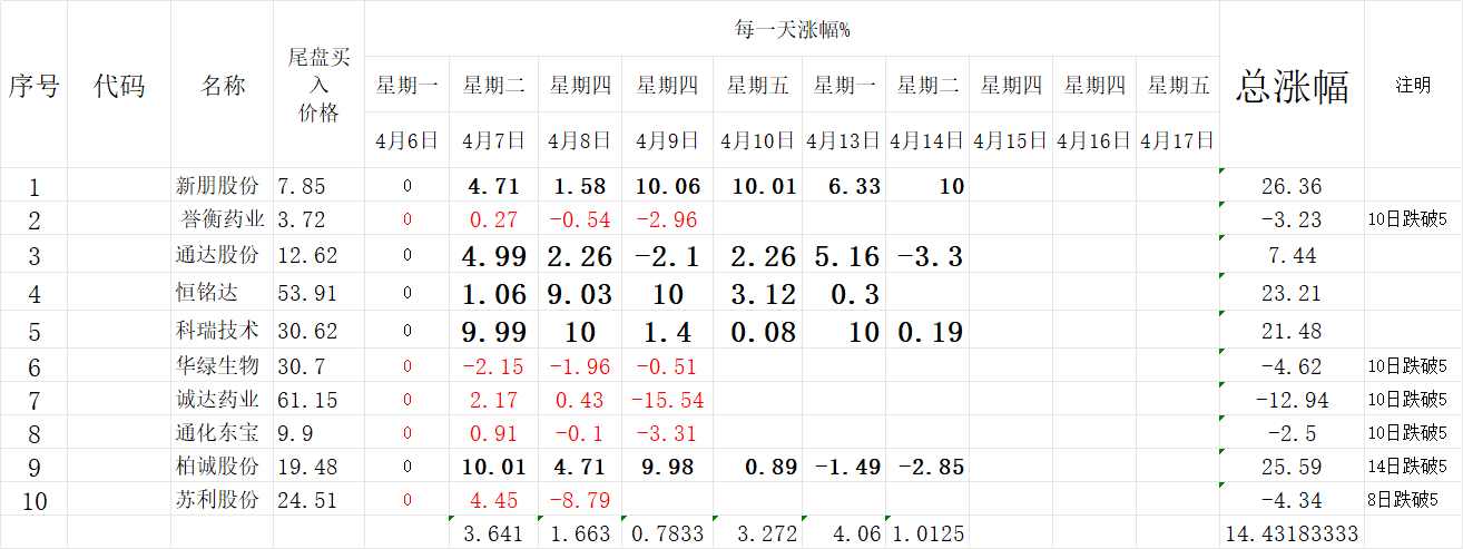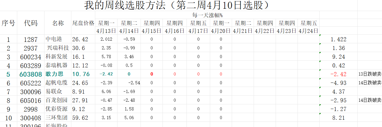 今天继续验证周线选股:4月3日选股如图: 4月3日选股还剩下4只股。 4月10日选出的10只股还剩下7只,如图 从4月10日开始实盘买入这10只个股,就是验证一下周线机械化选股是否值得买入,胜率如何: