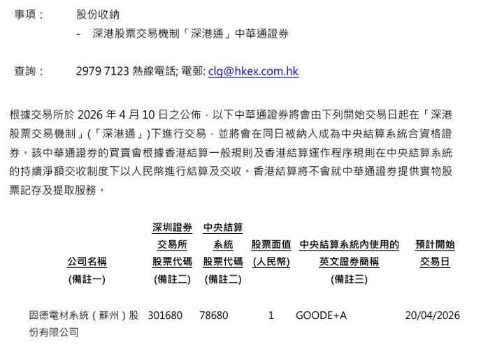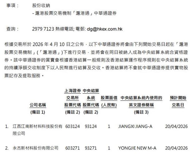 港交所:将固德电材(301680.SZ)、江南新材(603124.SH)等4只股票纳入沪深股通 4月20日生效
