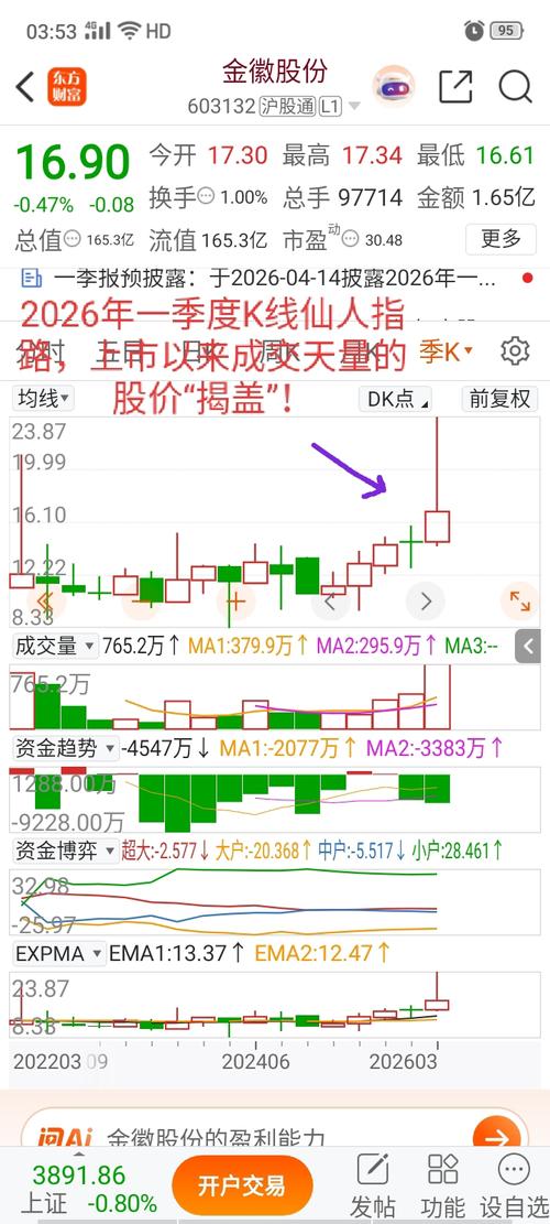 $金徽股份(SH603132)$ 2026年一季度K线“仙人指路”,上市以来成交天量的股价“揭盖”! 俊马踏驰恒势,“融资第一性”普世之投资智慧! (家人对话):希望你在“无聊”之时,抽空把我去年发在股吧的短信息和现在思考看一看。选股时股价是表象,更重要的第一大股,若是混合制民企要看是否能成为永续盈利的“百年老店”股权可代代传承,若是国资要看其母公司在国家发展中是否能逐步发展成为当代主流支柱企业。...