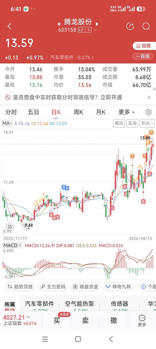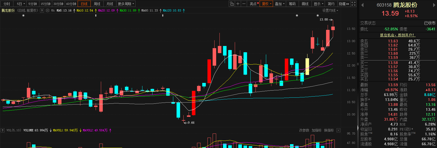 $腾龙股份(SH603158)$明天看看12.6能不能有支撑。