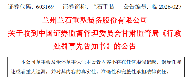 兰石重装(603169)被拟处罚!在2021年4月28日(含)至2026年4月22日(含)期间买入兰石重装(603169)股票,并于2026年4月23日及之后卖出或继续持有的投资者可以公.众.号:股民索赔号。