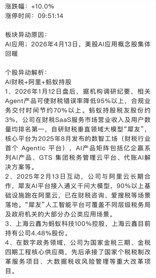$税友股份(SH603171)$ 市场上掀起了一波AI智能体的涨停潮,税友股份,顶点软件与华盛昌、协创数据一同成为领涨的先锋。 这波涨停潮并非无缘无故,主要有两个直接催化剂: ·巨头战略点火: 就在昨日(4月13日),阿里巴巴在战略会上首次明确提出,要全力推进“智能体经济”,并将其作为核心方向。这一顶级厂商的表态,立刻点燃了市场对整个产业链的想象空间。 · 资金情绪共振:在消息刺激下,今日资金迅速...