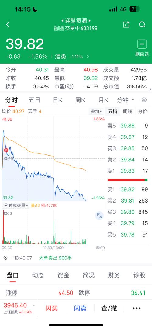 $迎驾贡酒(SH603198)$不上不下难操作,你敢来一个跌停绝对补仓100%