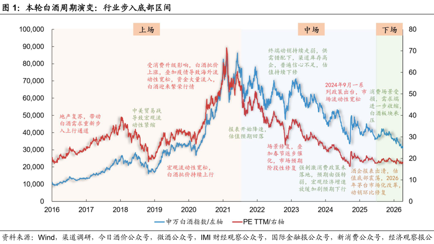 朋友们,今天白酒板块涨疯了!迎驾贡酒直接封板,老白干、古井贡酒这些老伙计集体蹦迪(截至2026年4月23日数据)。但别急着开香槟——这波反弹背后,白酒行业正躺在ICU里做透析呢! 周期魔咒:这次比2012年还惨? 国海证券的这张图把真相拍在咱脸上: 本轮调整已熬了4年,比史上任何一次都漫长! 为啥这么惨?库存堰塞湖+消费断崖双重暴击!2025年行业产量暴跌,经销商库存堆到2.5年才能清空(爱建证券...
