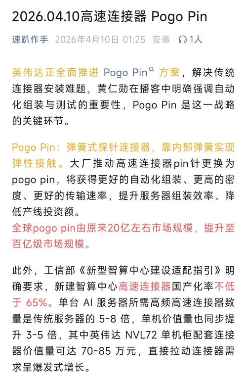 $快克智能(SH603203)$pogopin高速连接器又来了,应该就是快克给安费诺定制的高速连接器精密焊接产线