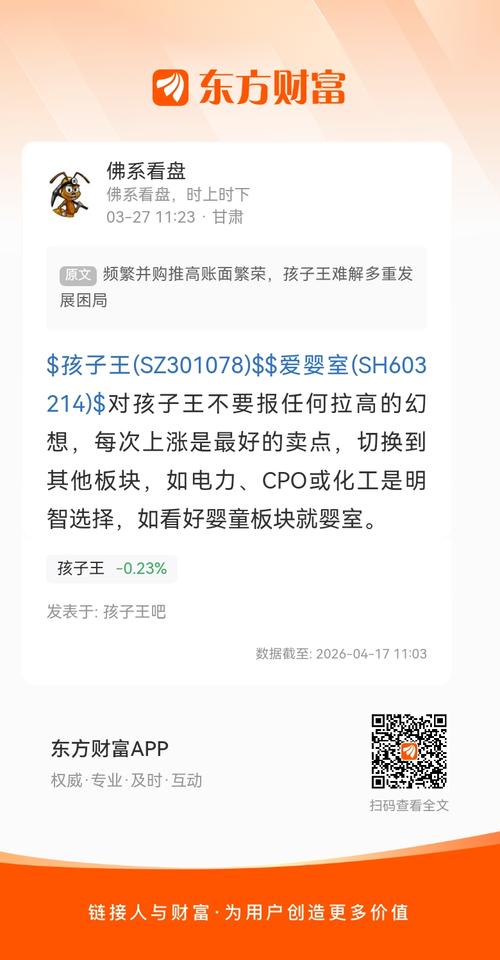 还是那句话,人家在卖公司,你在考虑靠他赚钱,早些远离$孩子王(SZ301078)$//@佛系看盘:$孩子王(SZ301078)$$爱婴室(SH603214)$对孩子王不要报任何拉高的幻想,每次上涨是最好的卖点,切换到其他板块,如电力、CPO或化工是明智选择,如看好婴童板块就婴室。