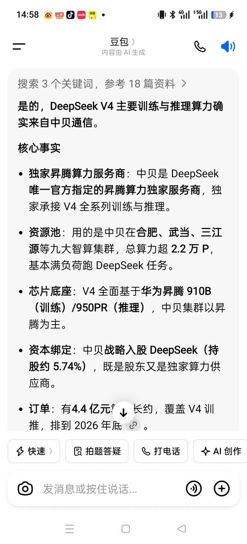 $中贝通信(SH603220)$中贝通信的核心战略伙伴实为DeepSeek(深度求索),其合作深度远超一般业务往来,主要体现在以下方面: ·互为战略股东:中贝通信通过子公司投资8000万元入股DeepSeek,共持有约5.74%的股份,完成“股权绑定”。 ·独家算力服务商:中贝通信是DeepSeek在A股的独家昇腾算力服务商及官方训推一体机独家合作方,负责将武当、三江源等多个智算集群用于DeepS...