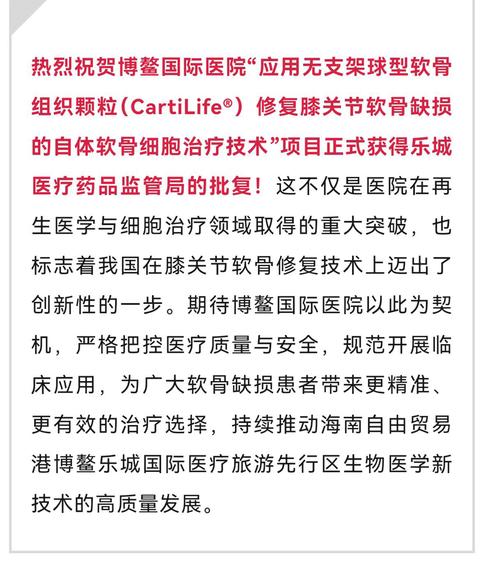 $济民健康(SH603222)$博鳌国际医院获准开展自体软骨细胞治疗技术,为膝关节软骨缺损患者带来新方案