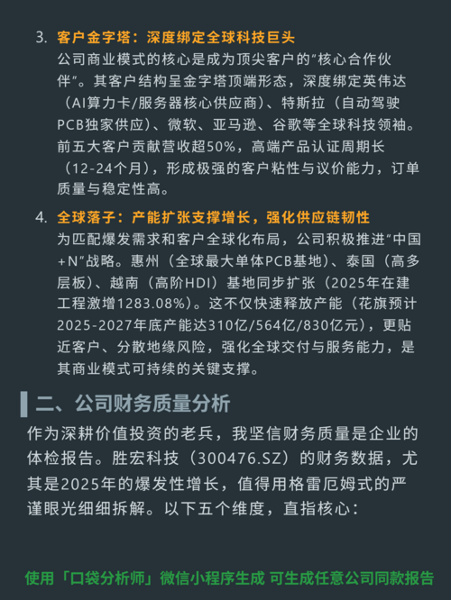 $ST东北高(SH600003)$$深南电路(SZ002916)$$景旺电子(SH603228)$最近研究胜宏科技,最大的感受是它抓住了AI服务器PCB的爆发机遇,2025年财务迎来质的飞跃。 聚焦AI服务器、数据中心所需高端PCB(高多层板、HDI),技术领先市场2-3年(6阶24层HDI良率98.5%,AI产品毛利率超40%),深度绑定英伟达、特斯拉等全球科技巨头(前五大客户占营收超50%),...