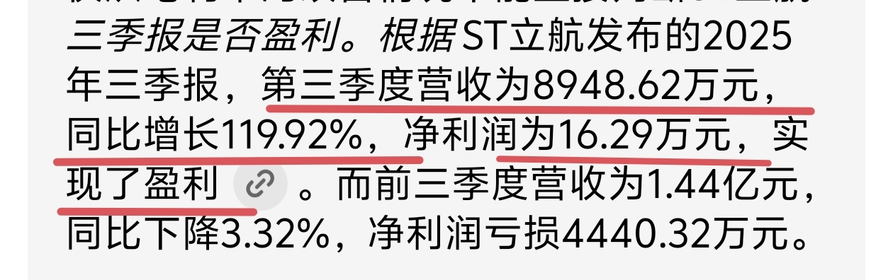 $*ST立航(SH603261)$猜一下,三季度收入7000万,累计1.2亿。多了就超预期,少了就打算扔了。