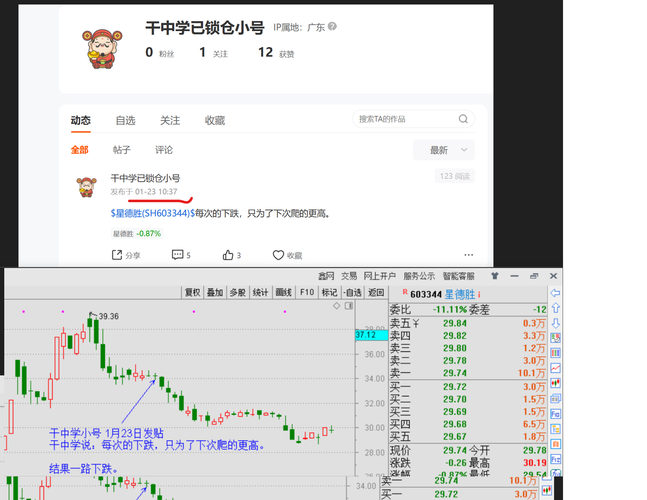 2赞- 大家看干中学已锁仓小号2026-01-23 10:37:19发贴说:“每次的下跌,只为了下次爬的更高。”结果次日一就下跌。 干中学本想在1月23日撞个壁,表现一下,以他当时23号看盘技术,当时走这样K线,干中学的意思是说:马上就是大涨了。想提前撞个壁,24号涨了,想大家来夸他。结果次日当场打脸,结果一路下跌。 截止现在下跌幅度高达-25%,结果不是爬得更高,是跌得更深。 这就是你们心目中“股神”神棍,实际他的本事就是乱猜。 这就是真面目的干中学的嘴脸。 现在看到干中学在吧里,还在发贴,要将大家带入-50%-60%跌幅深度。