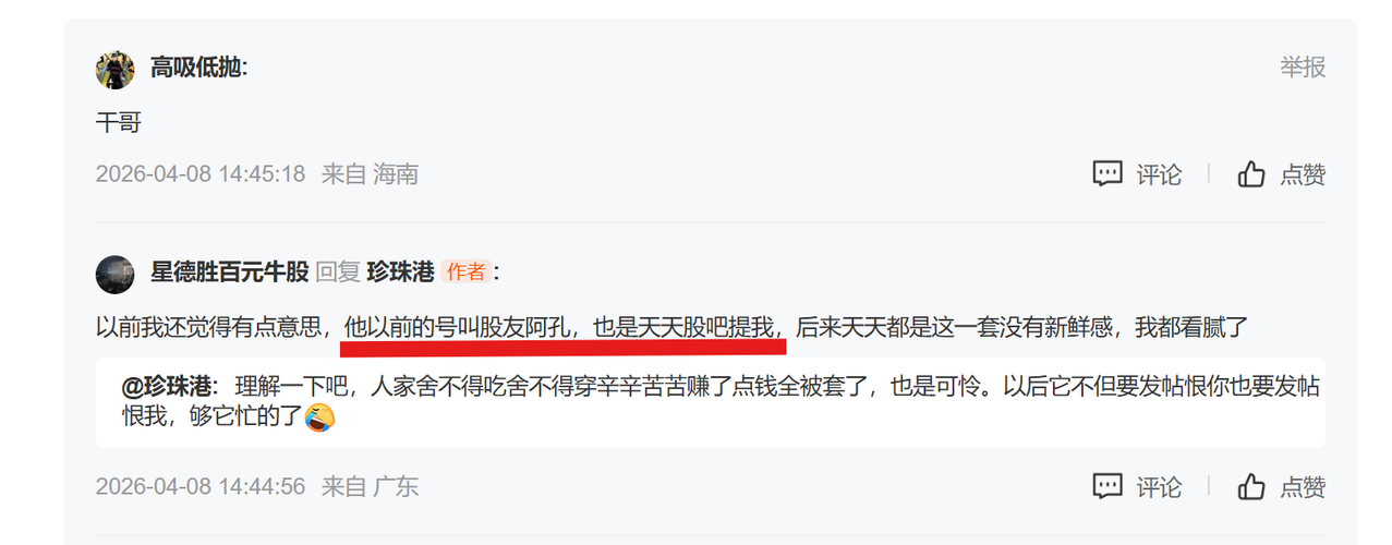 看下图,大家注意——干中学(即星德胜百元牛股)正在给他洗白。 干中学利用大家无法看到IP不同地址定位,借用”股友阿孔“只显示湖北,认为就是我账户湖北就是”股友阿孔“。呵呵~~ 清则自清! 大家想想”干中学“为什么要注销账户,为什么要说:“每次的下跌,只为了下次爬的更高。”结果次日一路下跌。 干中学发现”股友阿孔“显示湖北,不怎么上线,借用来狡辩。一切的一切,干中学电闸掩护自己电闸。 我发现干中学天...