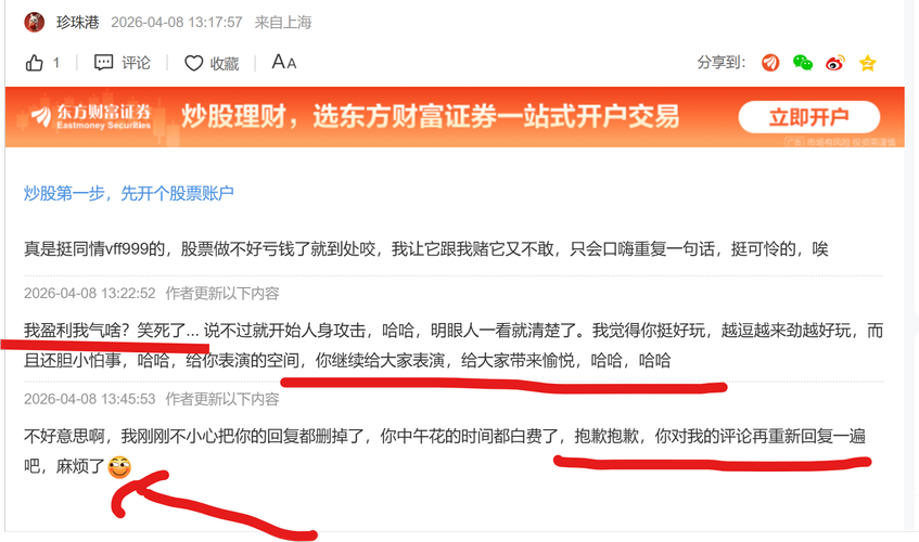 珍珠港又开了新贴,又气急败坏删除了我的评论。呵呵~~ 开新贴,就表示珍珠港生气了,想用新贴,学我,呵呵~~ 大家看她晚上23:49分还在发贴,说明珍珠港是比较焦虑的。呵呵~~ 正常人早就睡了,天天只望吧里的”神“。 我发现珍珠港和前阵子“一介散修在A股“,同样的病,总幻想对方亏得多惨。呵呵~~