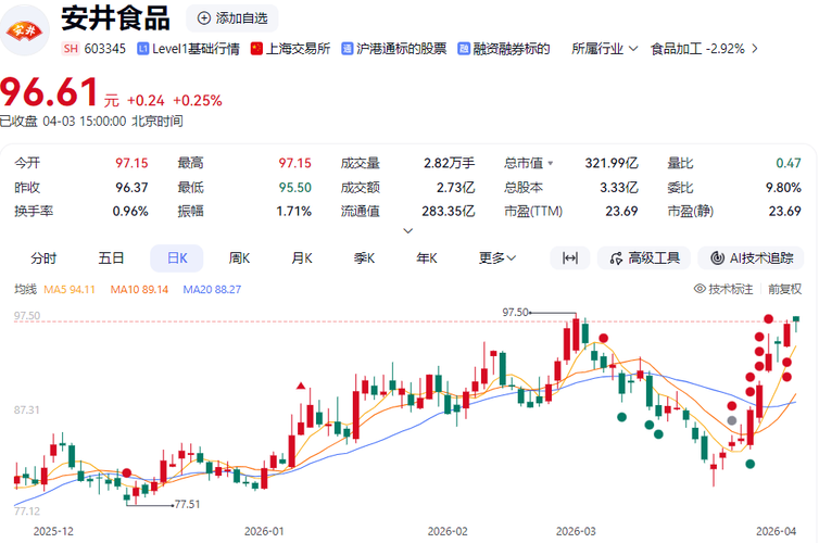 导语:股价蹿红背后,贴牌的预制菜才是最需要预防的“大雷”。 有“预制菜之王”“冻品一哥”之称的$安井食品(SH603345)$一波“九阳神功”直接带飞股价,从3月23日至4月3日,安井食品“9连阳”后“10连阳”,股价从81.3元/股一路抬升到96.61元/股,总市值达322亿元。 但在前几年预制菜爆火时,安井食品总市值曾一度窜至680亿元,随后逐渐下降,目前仍不到峰值的一半。 股市大涨的同时,安...