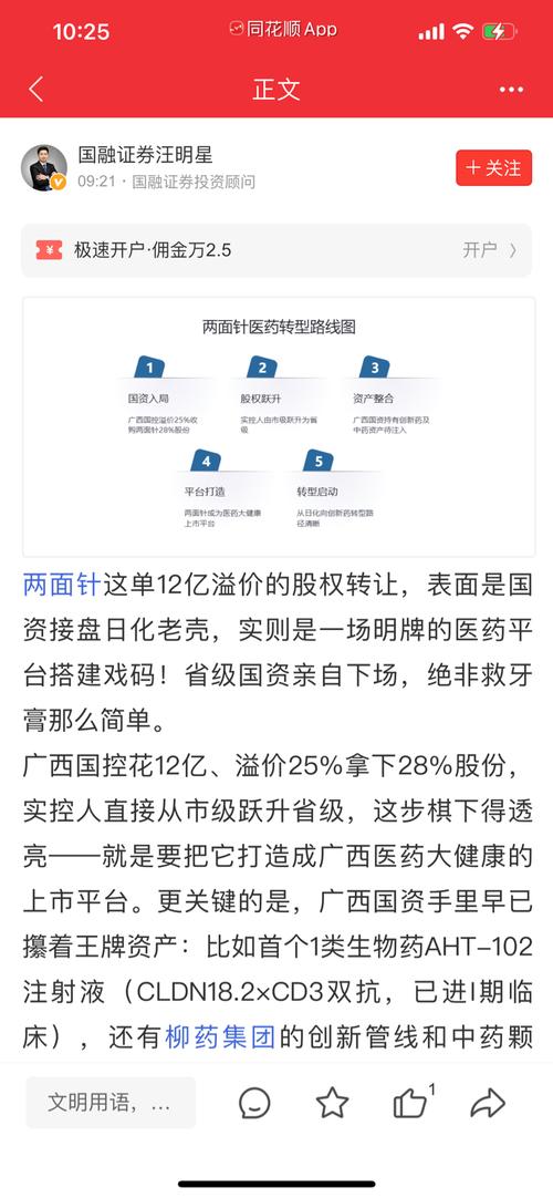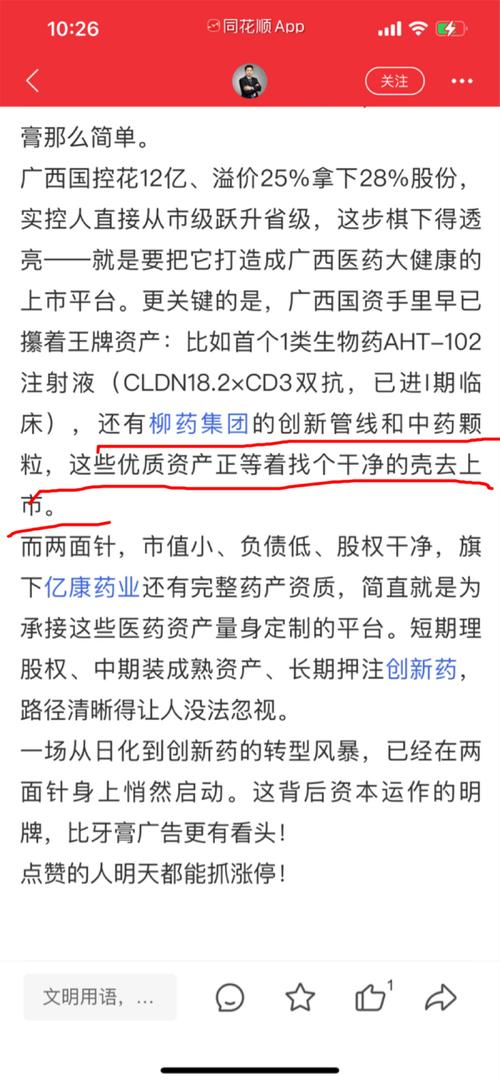 $柳药集团(SH603368)$$两面针(SH600249)$ 两面针这单12亿溢价的股权转让,表面是国资接盘日化老壳,实则是一场明牌的医药平台搭建戏码!省级国资亲自下场,绝非救牙膏那么简单。 广西国控花12亿、溢价25%拿下28%股份,实控人直接从市级跃升省级,这步棋下得透亮——就是要把它打造成广西医药大健康的上市平台。更关键的是,广西国资手里早已攥着王牌资产:比如首个1类生物药AHT-102注...