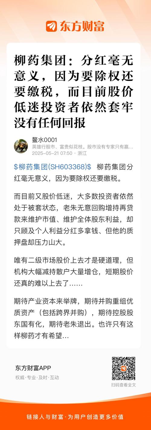 $柳药集团(SH603368)$柳药集团:分红毫无意义,因为要除权还要缴税,而目前股价低迷投资者依然套牢没有任何回报