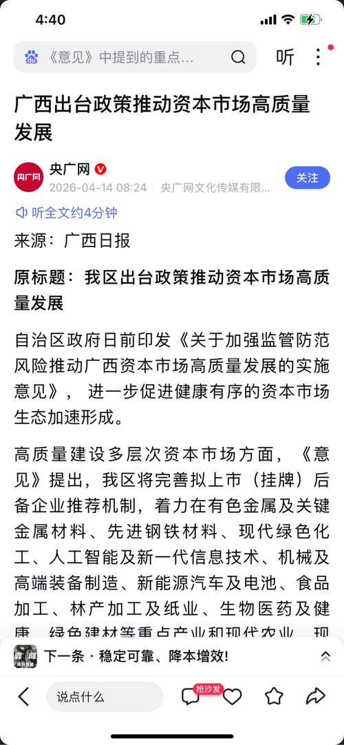 $柳药集团(SH603368)$$两面针(SH600249)$ 广西出台政策推动资本市场高质量发展 央广网 2026-04-1408:24央广网文化传媒有限公司官方账号 关注 听全文约4分钟 来源:广西日报 原标题:我区出台政策推动资本市场高质量发展 自治区政府日前印发《关于加强监管防范风险推动广西资本市场高质量发展的实施意见》,进一步促进健康有序的资本市场生态加速形成。 高质量建设多层次资本市场...