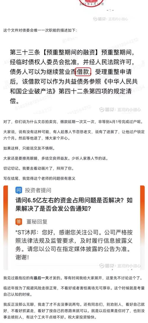 $*ST沐邦(SH603398)$巫山的信徒们,你们那么喜欢洗地,那我们就好好辩一辩。 1.一债会 巫山自己明确说了一债会只选举了债委会,没有对债委会进行任何授权。 那么巫山凭什么能说出债委会要开展实质性工作了? 是巫山自己不知道债委会要进行实质性的工作要先通过全体债权人会议进行授权吗,先授权债委会进行相应实质性工作的权利。 如果巫山这样不懂,那么我能不能理解为,他根本不懂重整,之前所有的帖子都是...